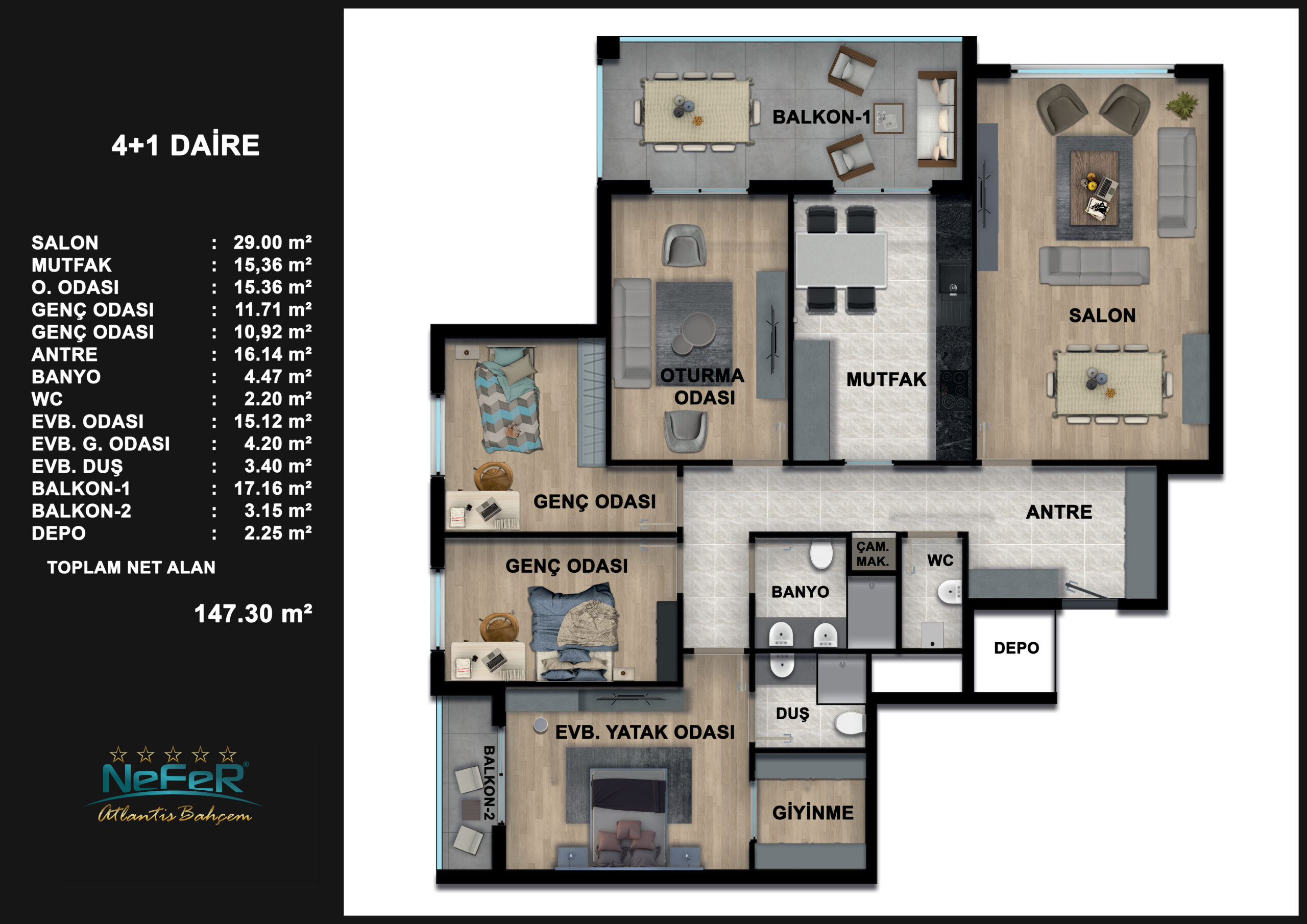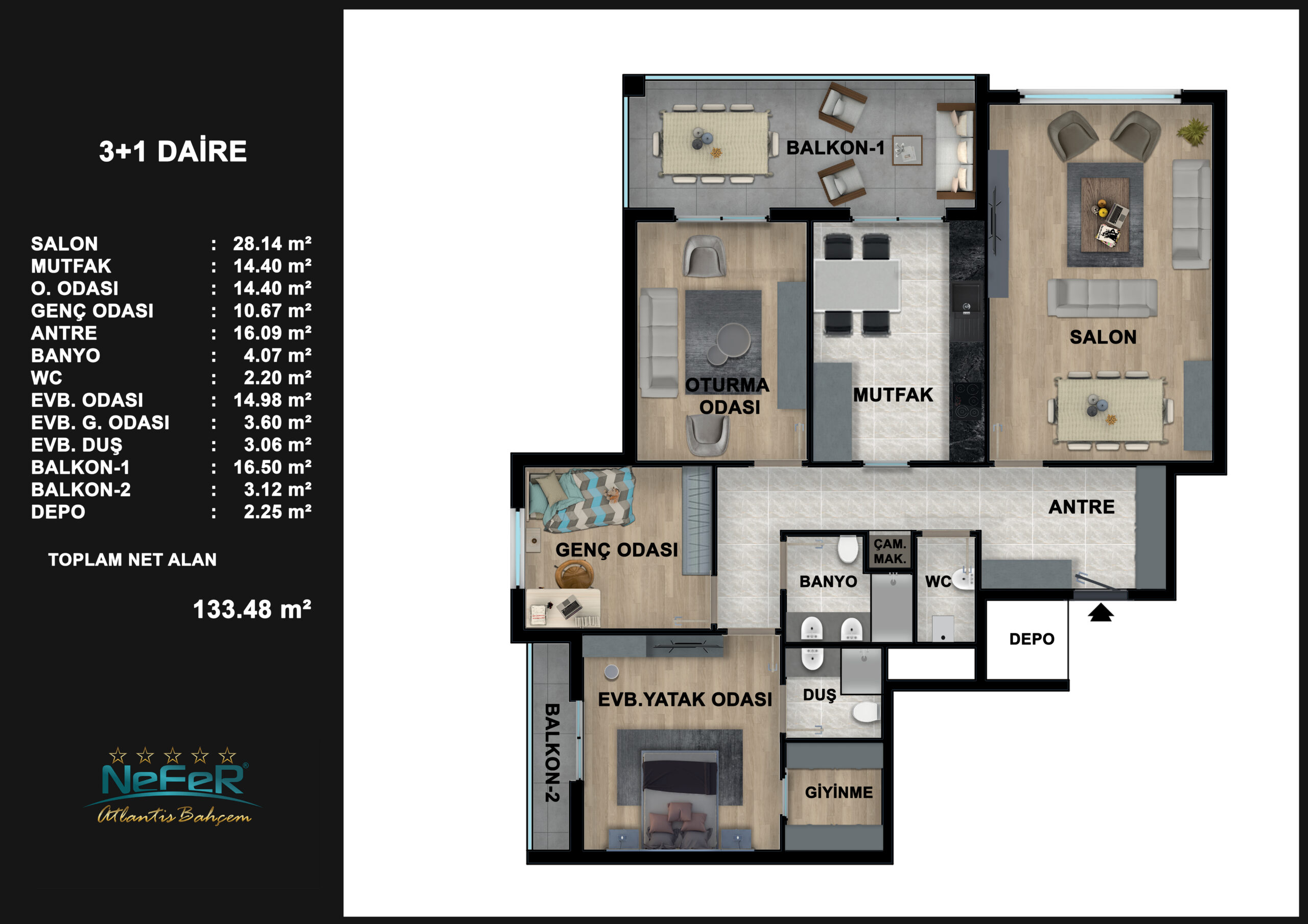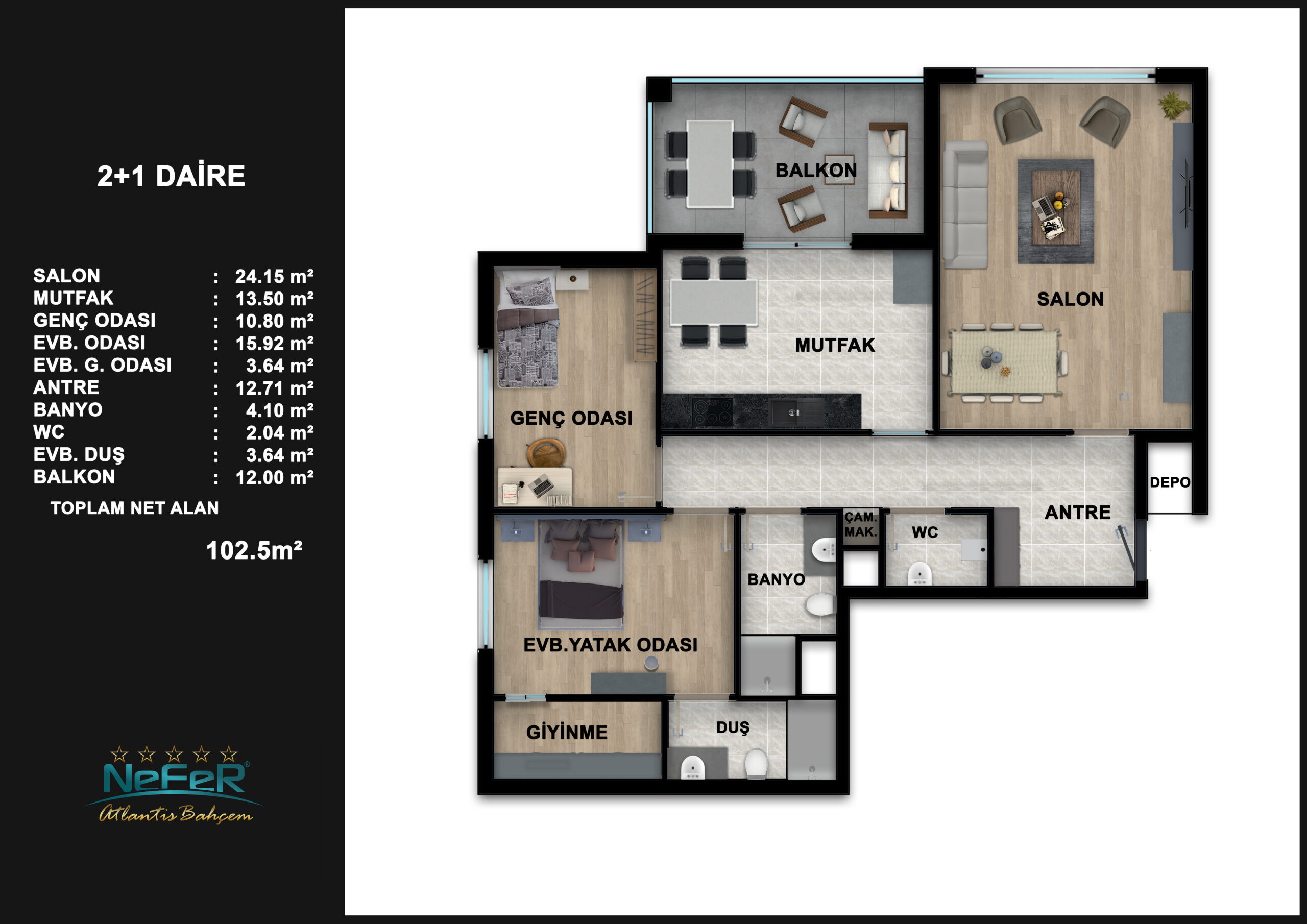 Nefer Grup imzalı Atlantis Botanik, Törekent’in en köklü ve değer kazanan projelerinden biri olarak 2+1, 3+1 ve 4+1 daire seçenekleriyle güvenli bir site hayatı sunmaktadır.
